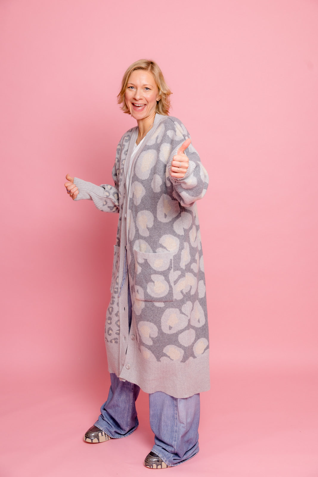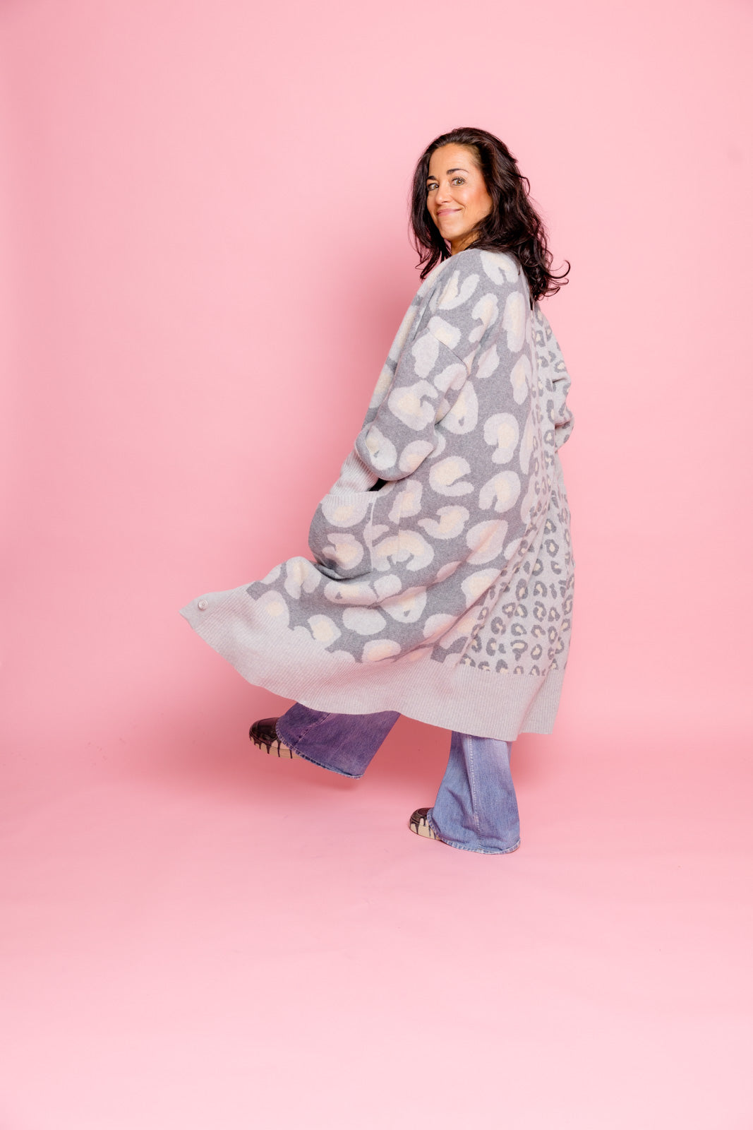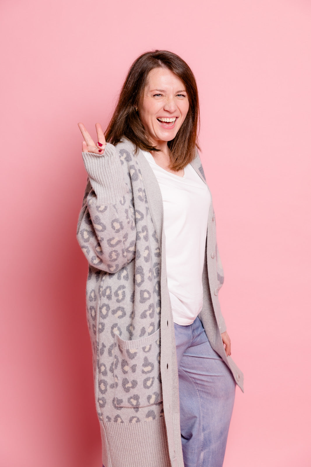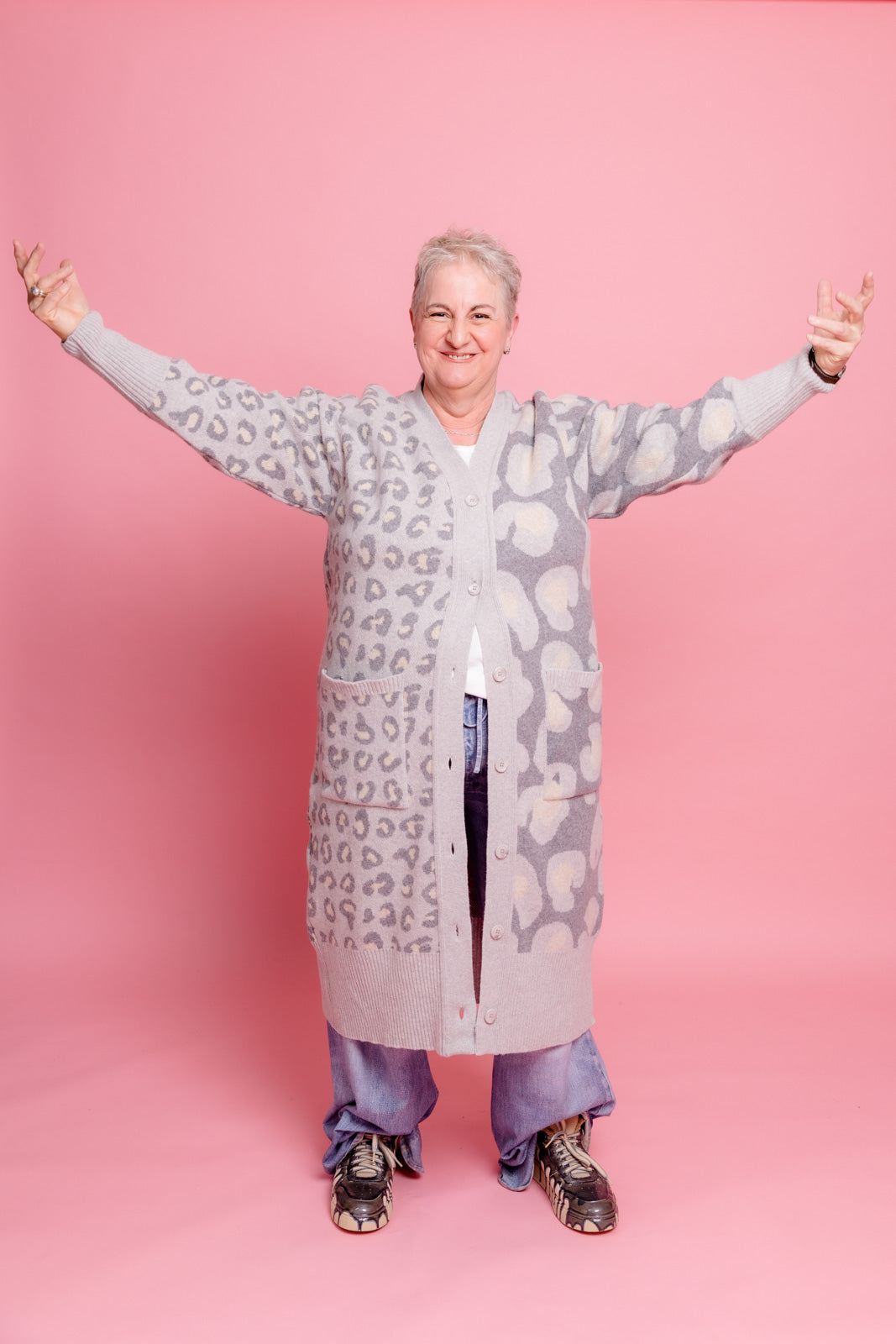 Mein grauer Leoparden-Cardigan ist der perfekte Begleiter, um im Mode-Dschungel den Ton anzugeben.