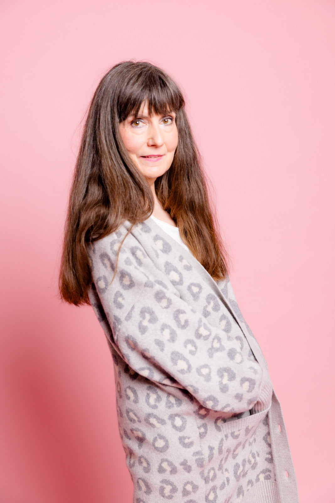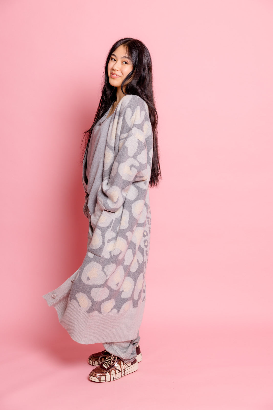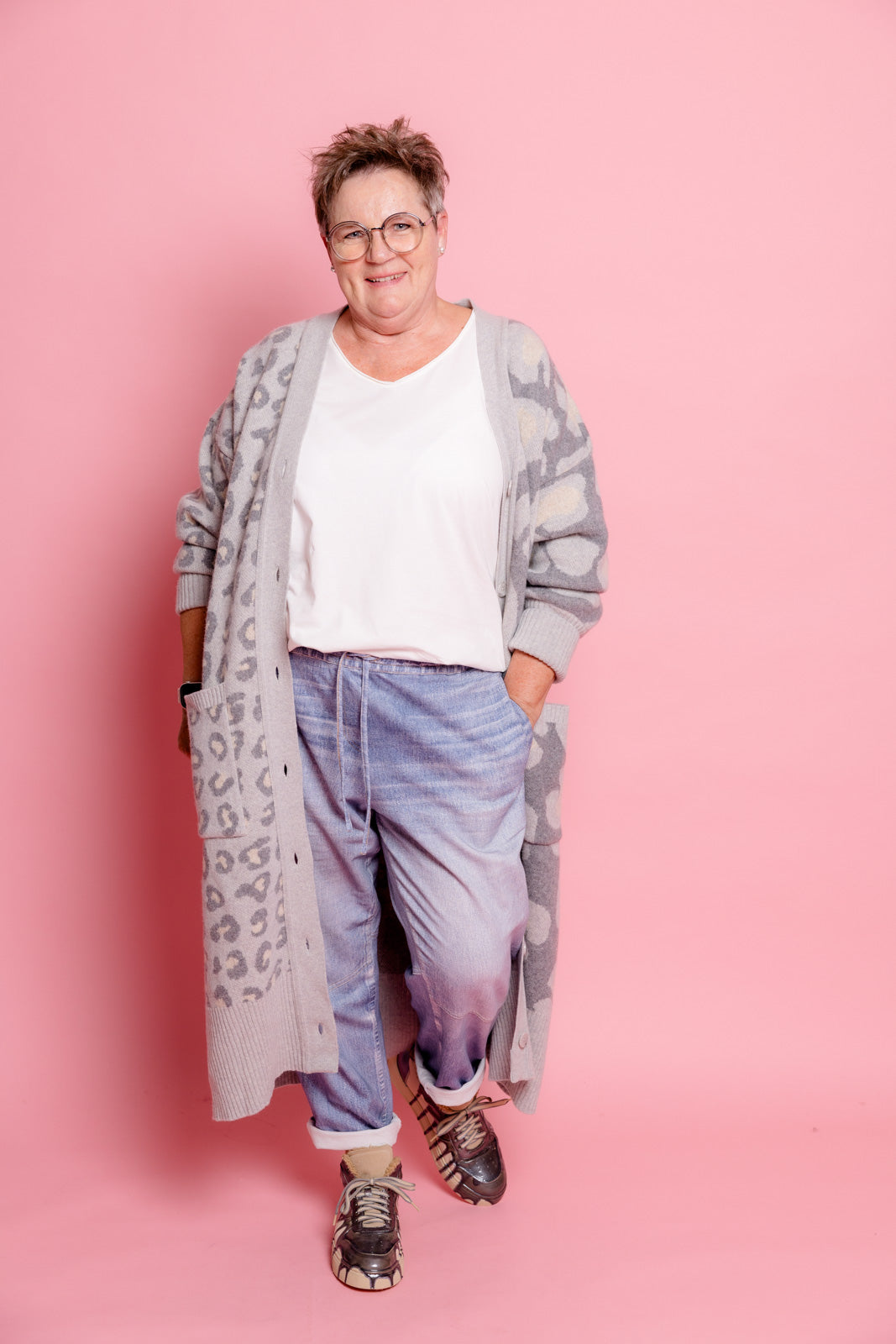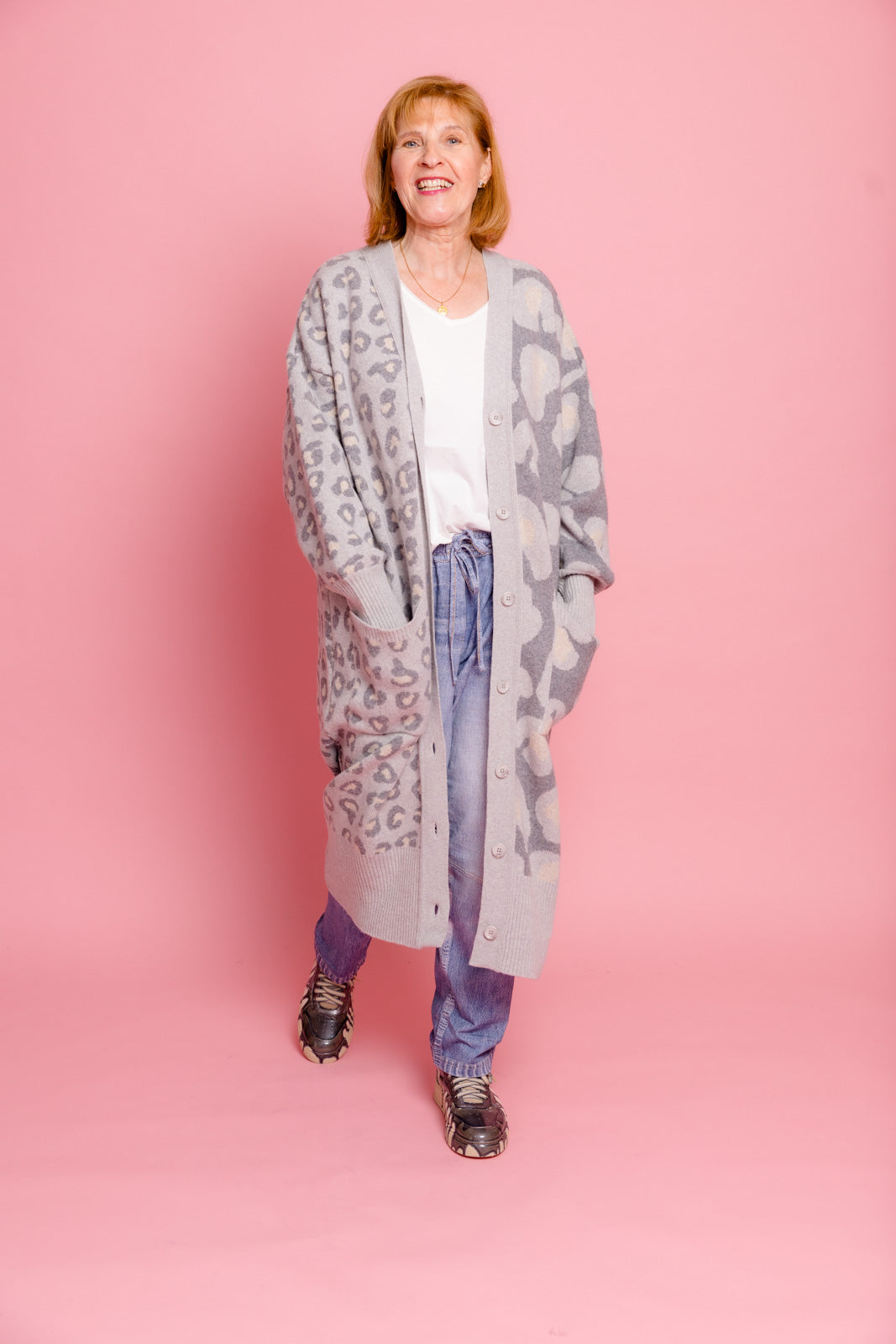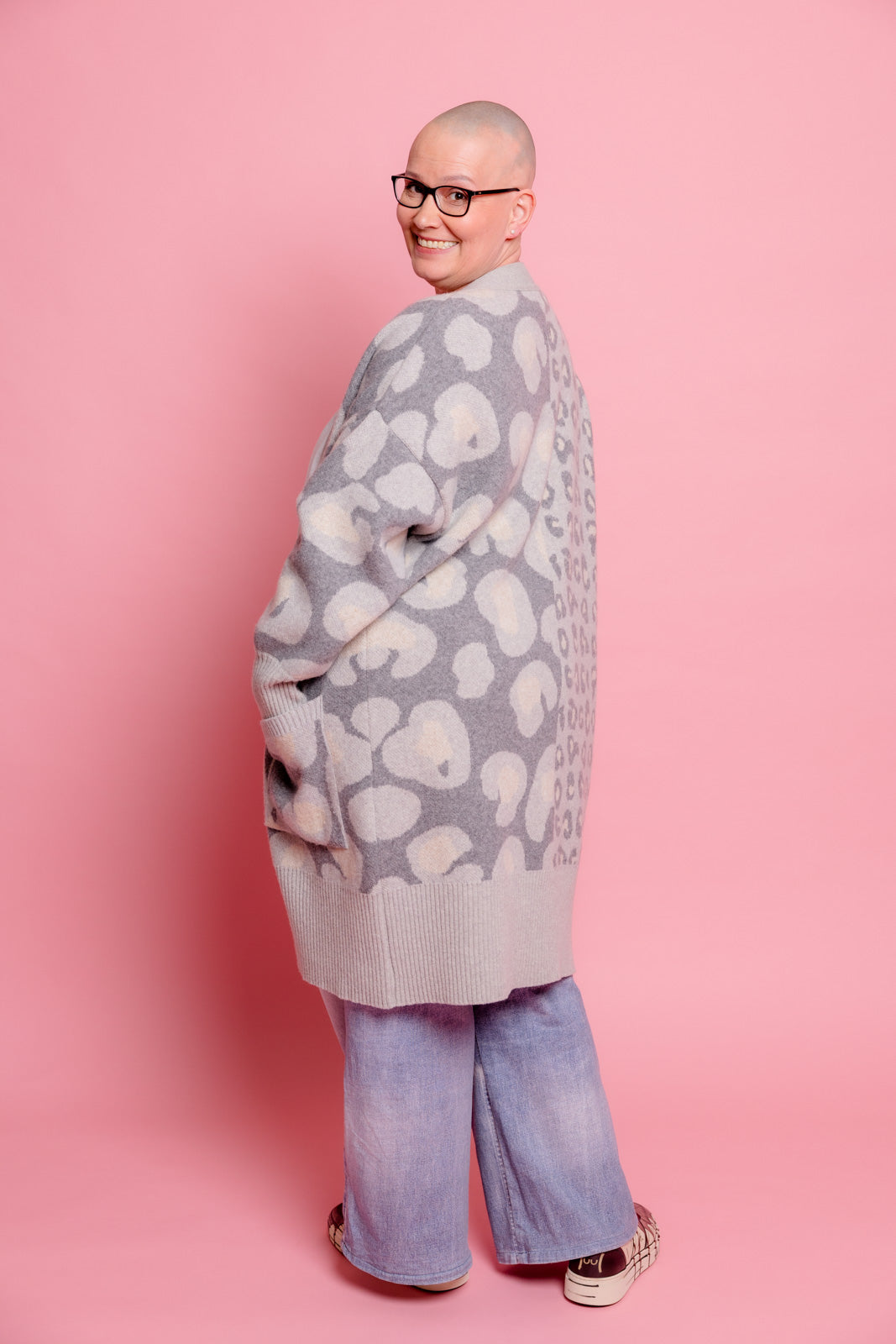 Mein grauer Leoparden-Cardigan ist der perfekte Begleiter, um im Mode-Dschungel den Ton anzugeben.